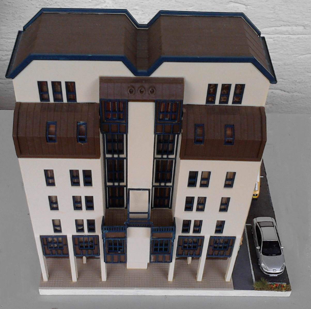 Hier war der Aufwand nicht so groß, da das Geschäftshaus bereits fertig gebaut war und daran nichts verändert werden soll. Einzig die Blumenkästen habe ich mit buntem Flockmaterial "aufgefüllt".