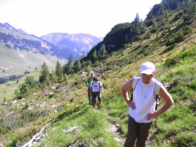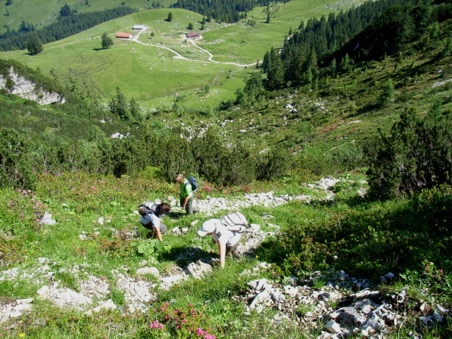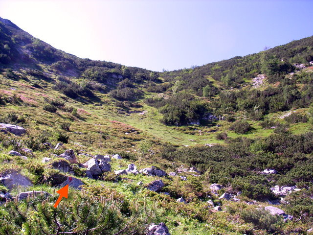 Einige Zeit später erreichten wir die Grasfläche und hier wurde der Weg auch wieder etwas flacher und war deshalb nicht mehr so anstrengend. Aber noch lag das letzte Drittel vor uns, das durch das Latschenfeld auf den Kamm führte.