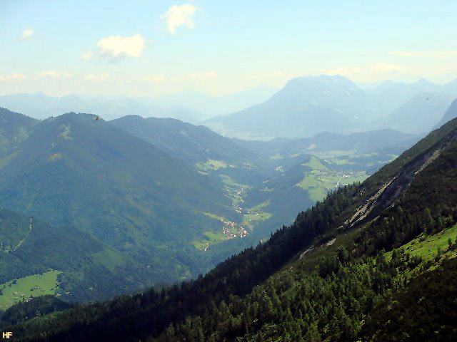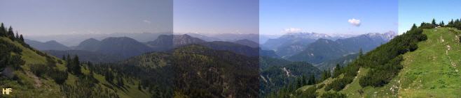 über die Alpen. Leider habe ich es noch nicht geschafft, die Farbänderungen, die durch den unterschiedlichen Lichteinfall entstehen, zu korrigieren. Auf der linken Seite erkennt man schon den Anfang vom Gipfelweg. Zum Vergrößern auf das Bild klicken.