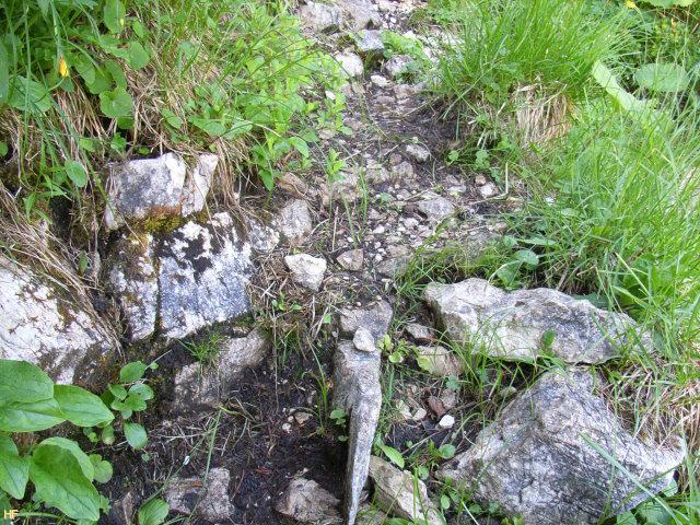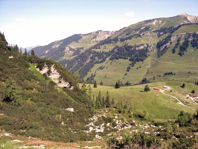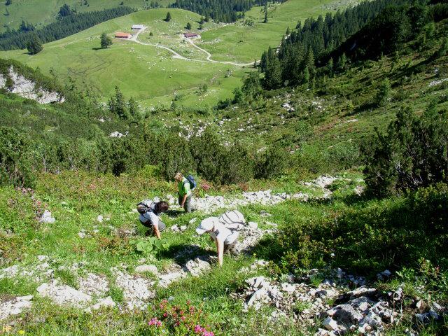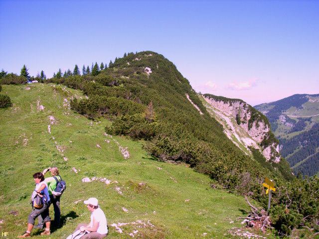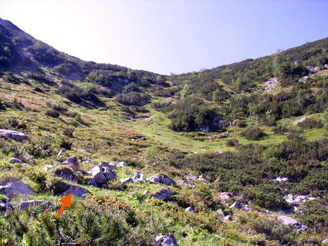 ist das Ende des Pfads durch das Latschenfeld. Total durchgeschwitzt und auch erschöpft, legten wir eine Pause ein. Immerhin hatten wir den Aufstieg vom Parkplatz bis hierher in knapp 1 1/4 Stunden - ohne die Brotzeit weiter unten - bewältigt.