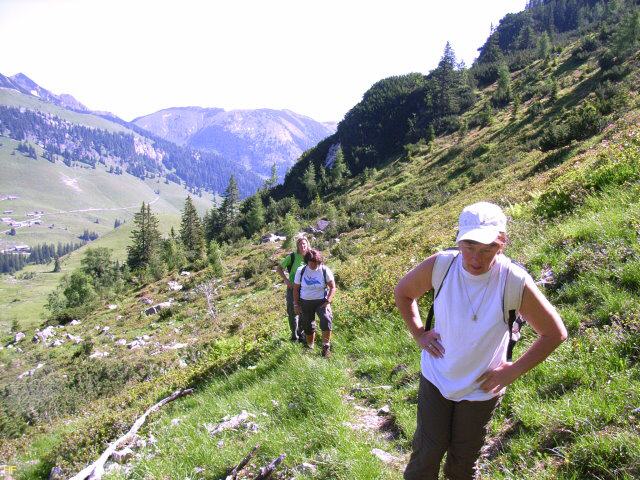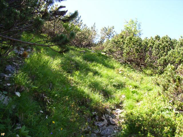Einige Zeit später erreichten wir die Grasfläche und hier wurde der Weg auch wieder etwas flacher und war deshalb nicht mehr so anstrengend. Aber noch lag das letzte Drittel vor uns, das durch das Latschenfeld auf den Kamm führte.