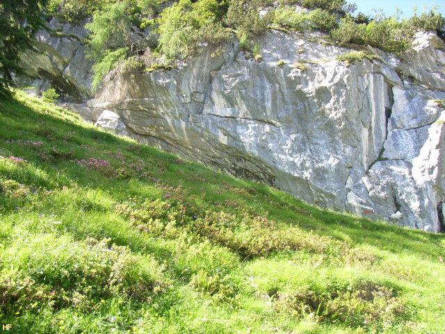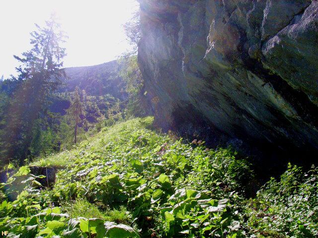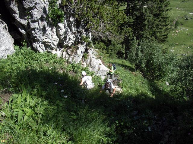 Ich zeigte den Mädels dann, wo es dann weiterging und ich konnte deren skeptische Blicke schon verstehen. Ganz geheuer war es mir auch nicht, weil weiter oben diese Felswand war und man weit und breit nicht den kleinsten Ansatz eines Weges oder Pfades erkennen konnte.