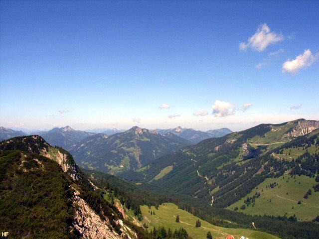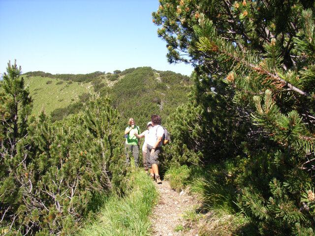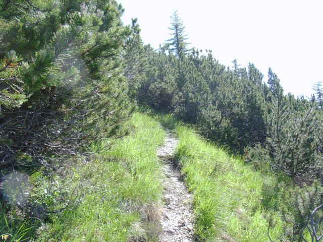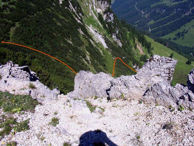 Nach unserer Pause folgten wir dem nun gut erkennbaren Weg am Kar entlang. Fast die ganze Strecke ging es aber wieder durch die Latschen, was teilweise auch ganz gut war, denn nur ein paar Schritte trennten uns von dem steilen Felsabbruch.