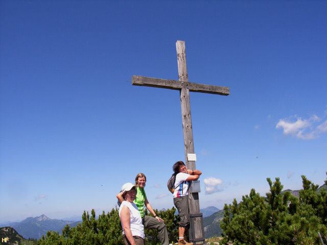 Ingrid umarmt nach diesen Strapazen glücklich das Gipfelkreuz (zum Scherz)
