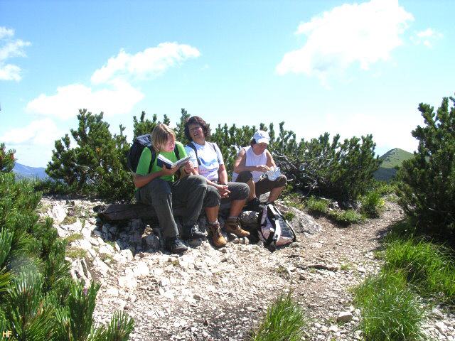 Die obligatorische Gipfelbrotzeit durfte natürlich nicht fehlen. Bianca stöbert derweil im Gipfelbuch